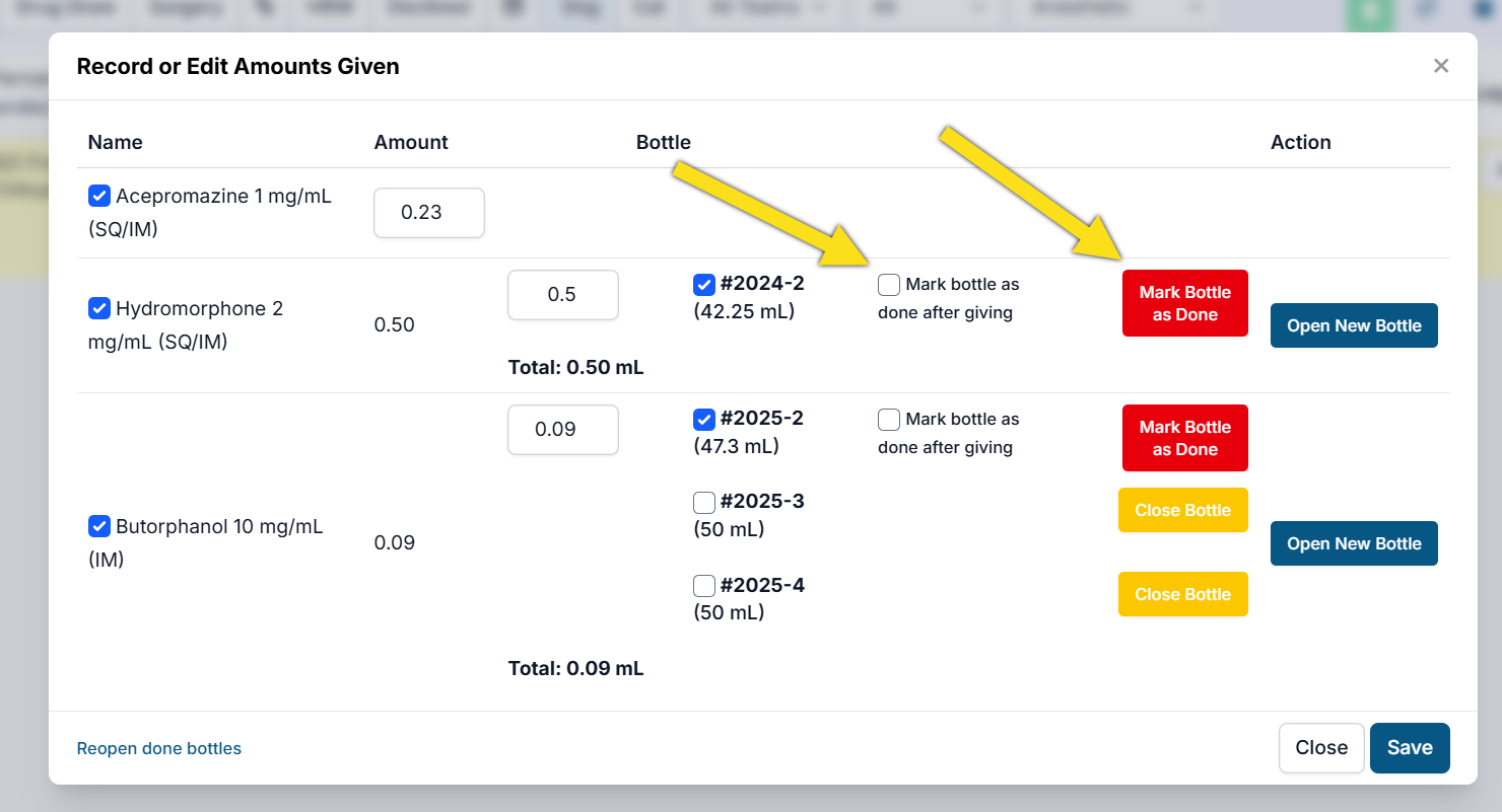- If you are using the last remaining amount on your current drug draw, you will tick the box that says Mark Bottle as Done After Drawing. This will Done the bottle after you record that drug amount.