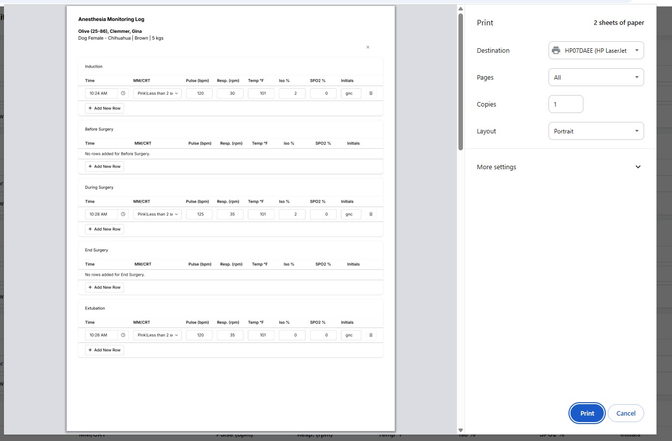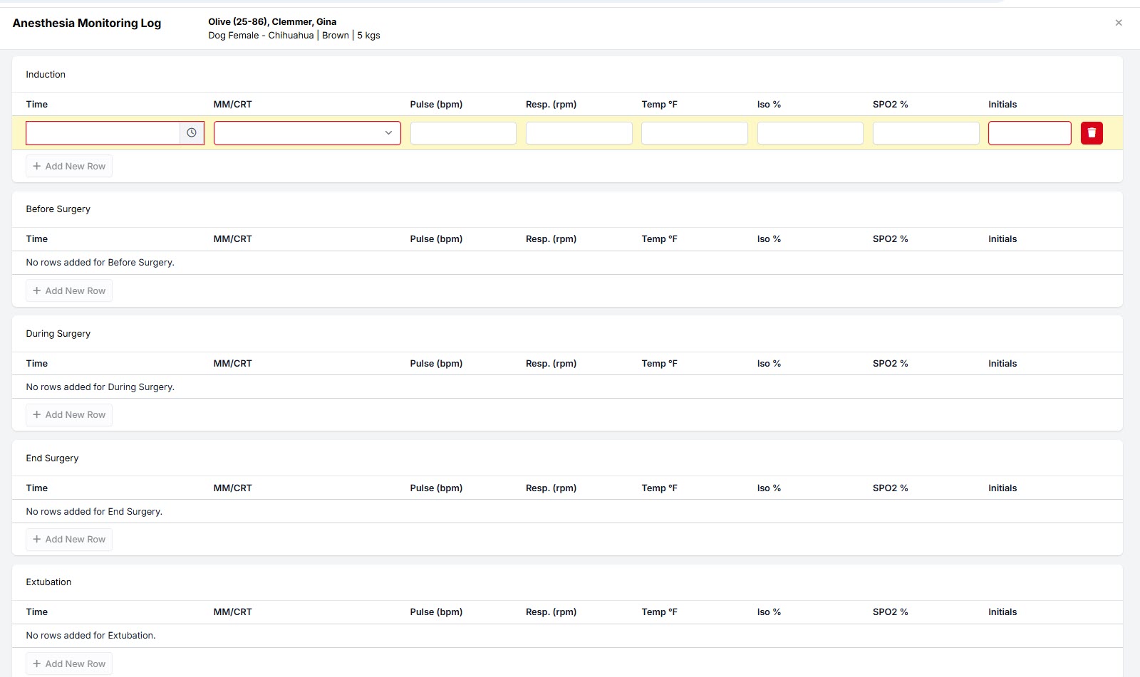 The Anesthesia Monitoring Log is where you can record patient vitals at Induction, right before surgery, during surgery, after surgery and during extubation. You can enter as many entries as you like.