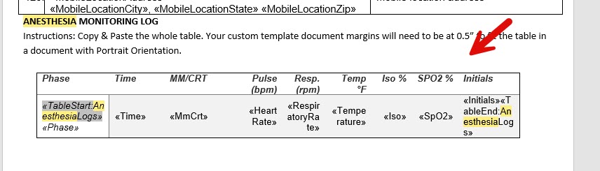 - You can create your own Anesthesia Monitoring Log template or drop the merge fields into a pre-existing template. You access the merge fields here And the table to copy and paste is at the end of the document.