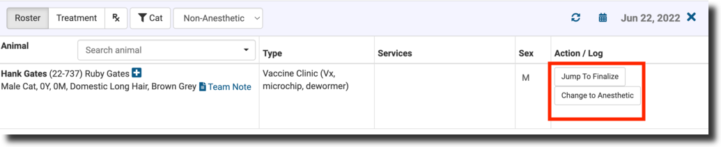 - Patient Flow's Non-Anesthetic has different screen flows than the Anesthetic. When animals are checked in for a non-anesthetic wellness appointment, they will appear on the Roster.