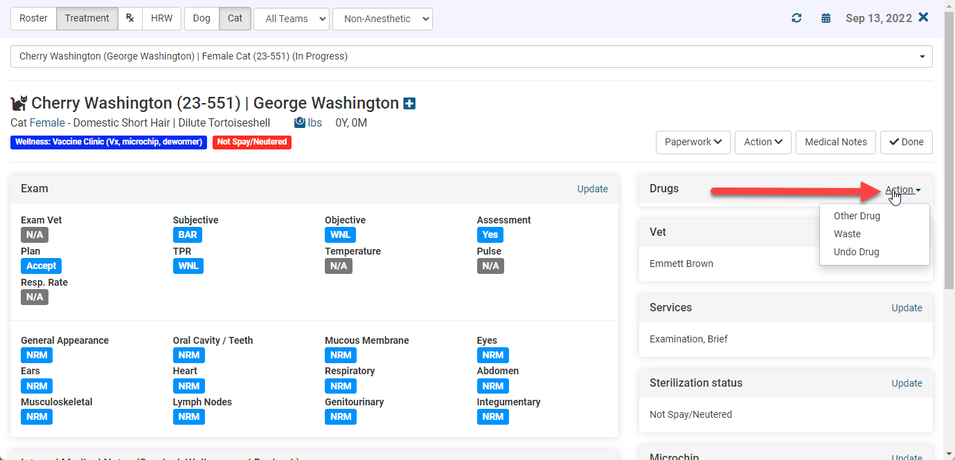 - For a non-anesthetic procedure, like a recheck, you can click Jump to Finalize and input the information you need. If you end up needing to give the animal drugs or a prescription, you can do that in the same way in their profile by adding drugs in the top right.