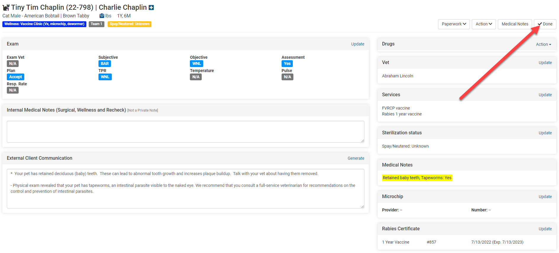 - When the animal is finished all drugs logged and notes recorded, you may then click Done and that means the animal is done with the visit.