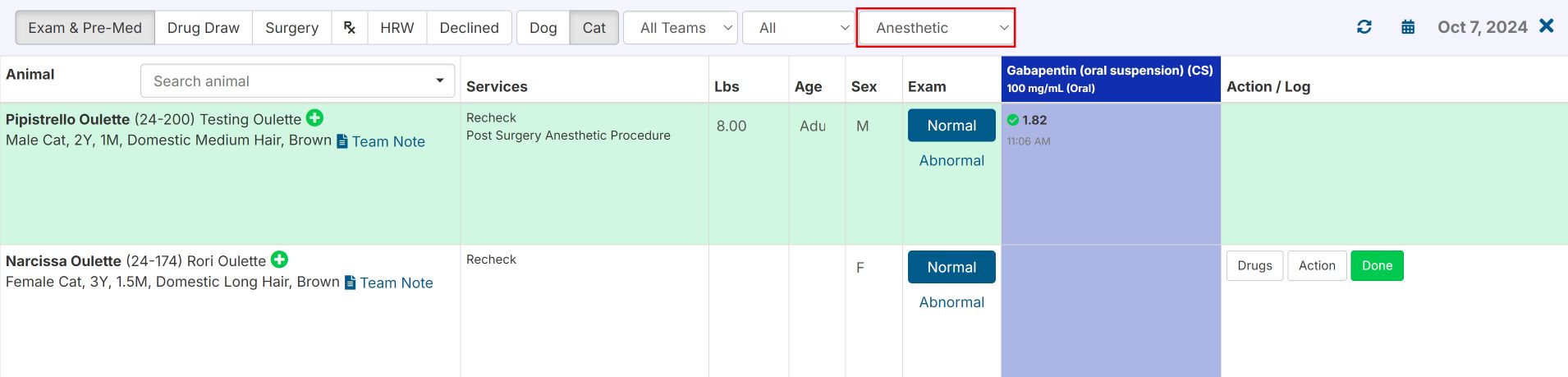 When the patient is on the Patient Flow Exam & Premed screen, you can see the animal through Patient Flow and log the appropriate drugs, make surgical notes, and generate paperwork just like you would a spay/neuter surgical appointment
