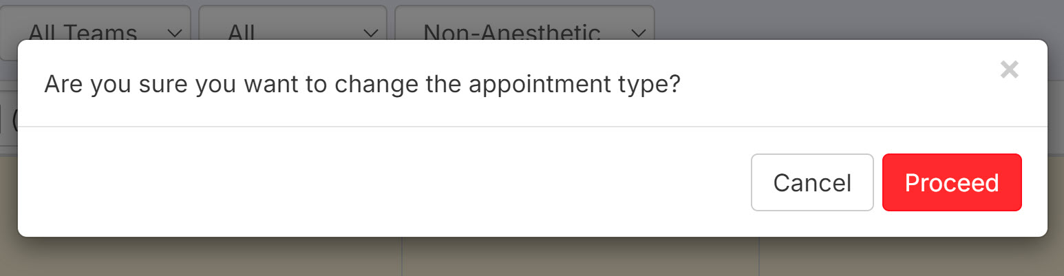 Once you click on Change to Anesthetic, you will receive a popup asking if you are sure you want to change the appointment type. Please Note: you cannot change the appointment type back to non-anesthetic once you have changed it to anesthetic.